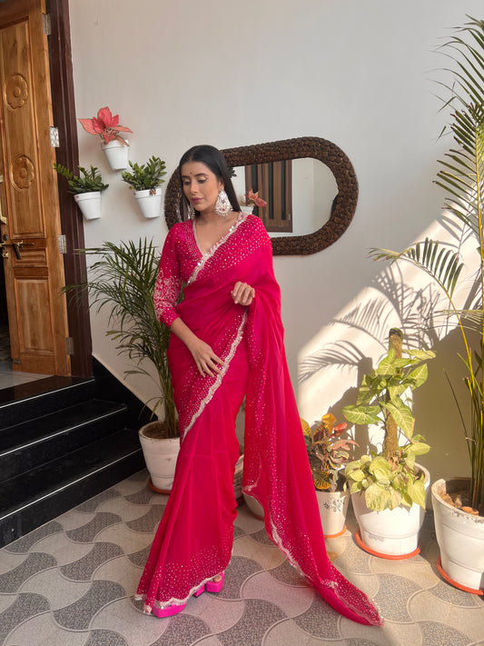 Magenta Pink Pure Crêpe Designer Saree with Zardozi and Tara Work and Beautiful Designer Full Work Stitched Blouse