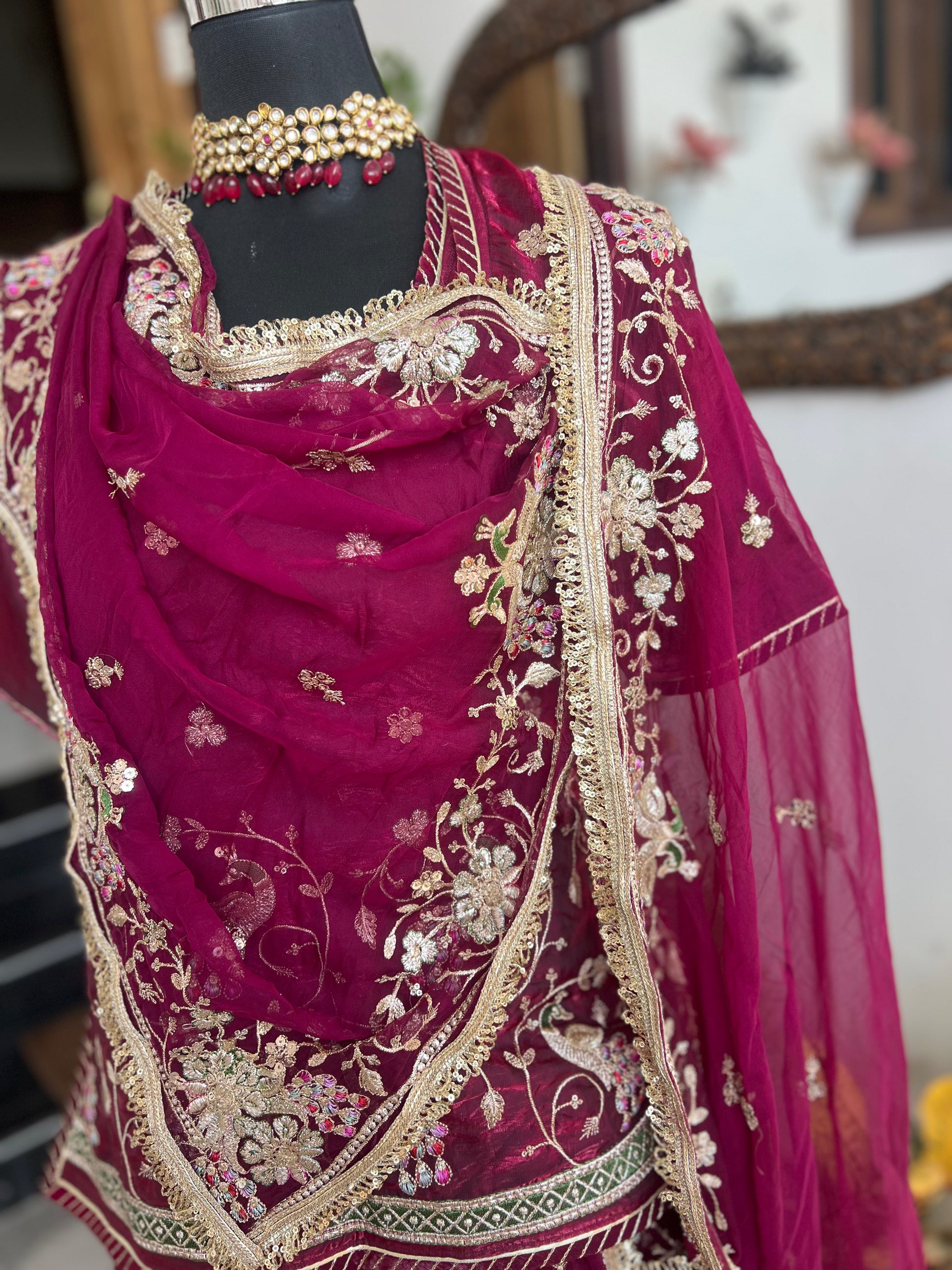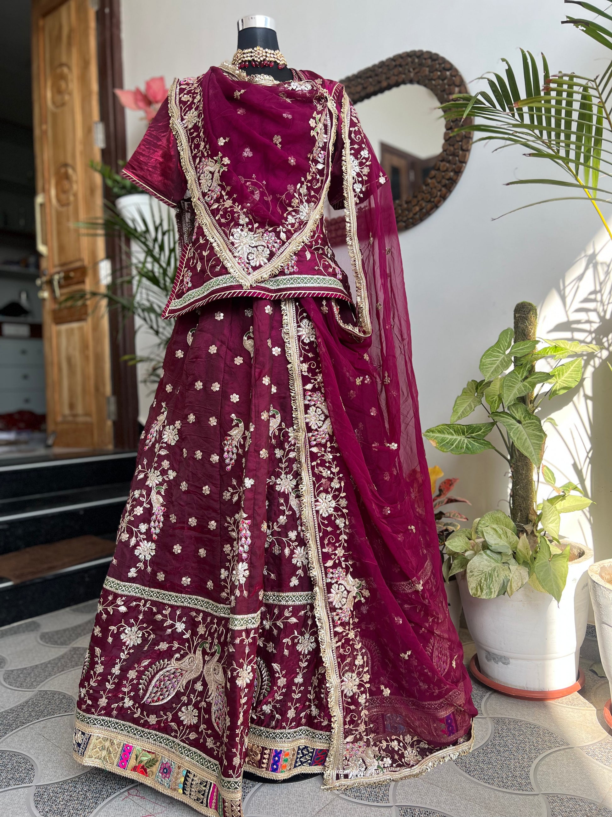 A masterpiece of grace — a peacock-inspired poshak with a royal full ghera and pure, luxurious fabric. Timeless, traditional, and truly breathtaking. (Stitched)