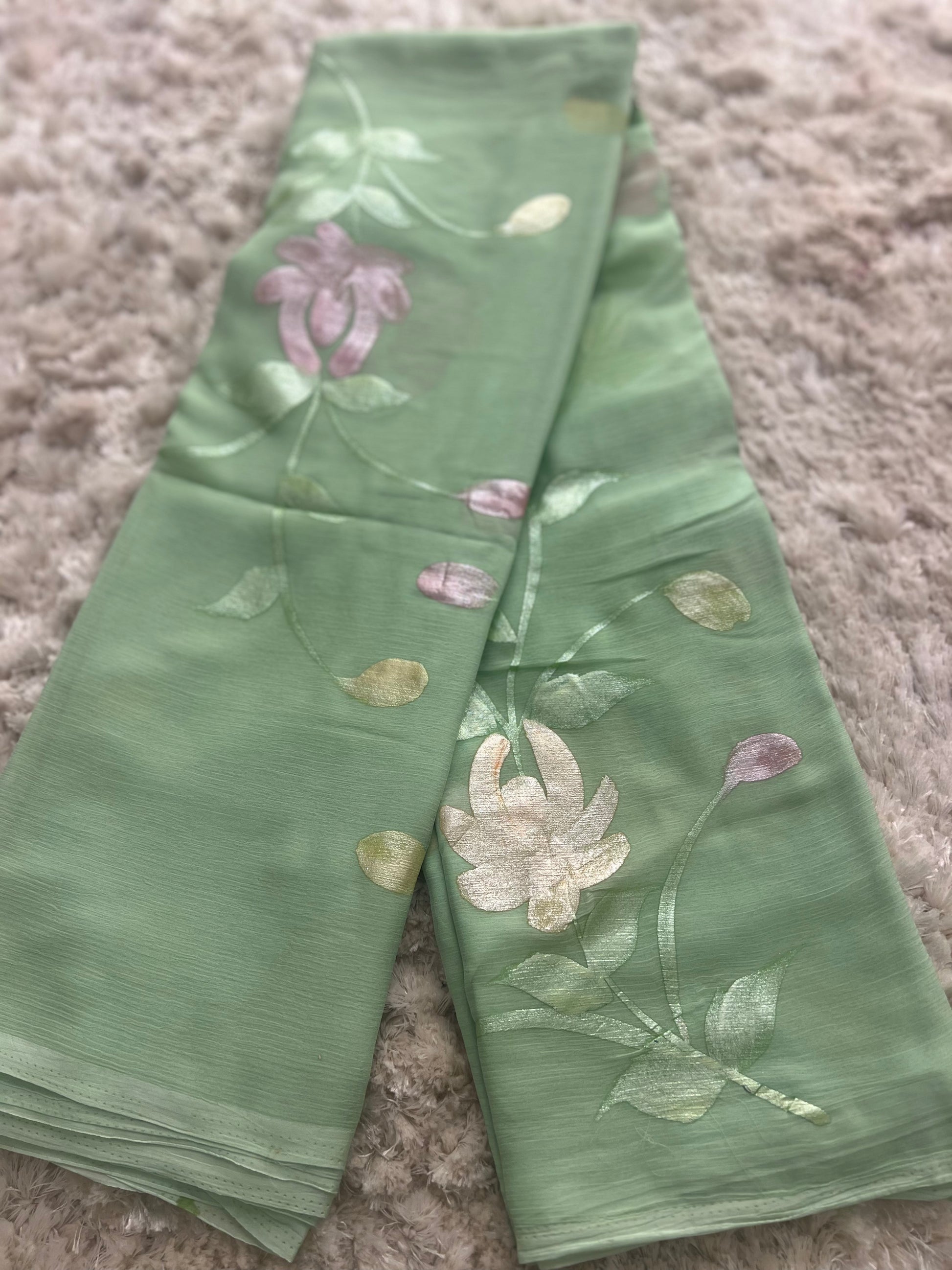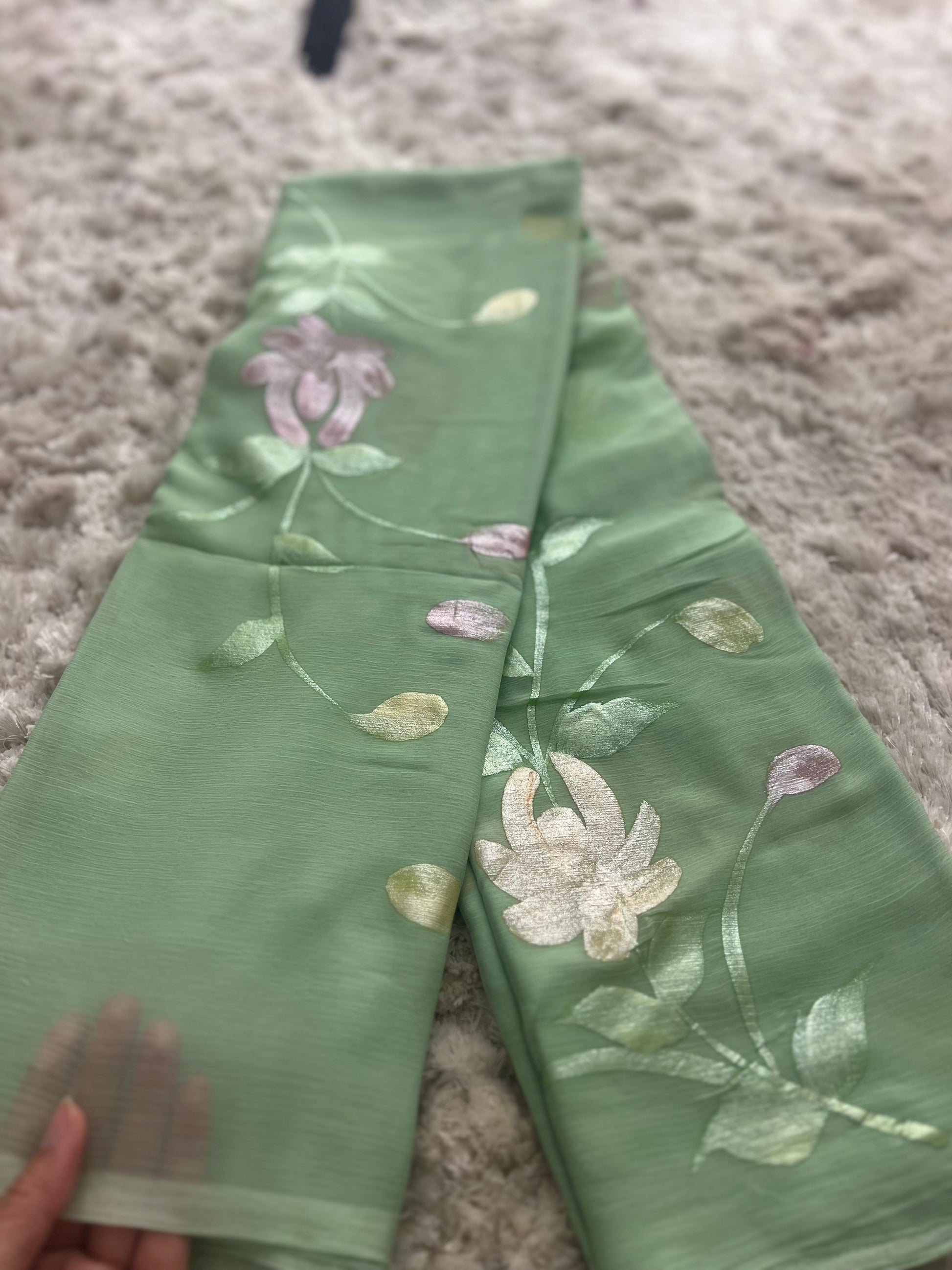 Beautiful Hand Painted Pista Green Colour Chiffon Sarees with Crêpe Blouse Piece