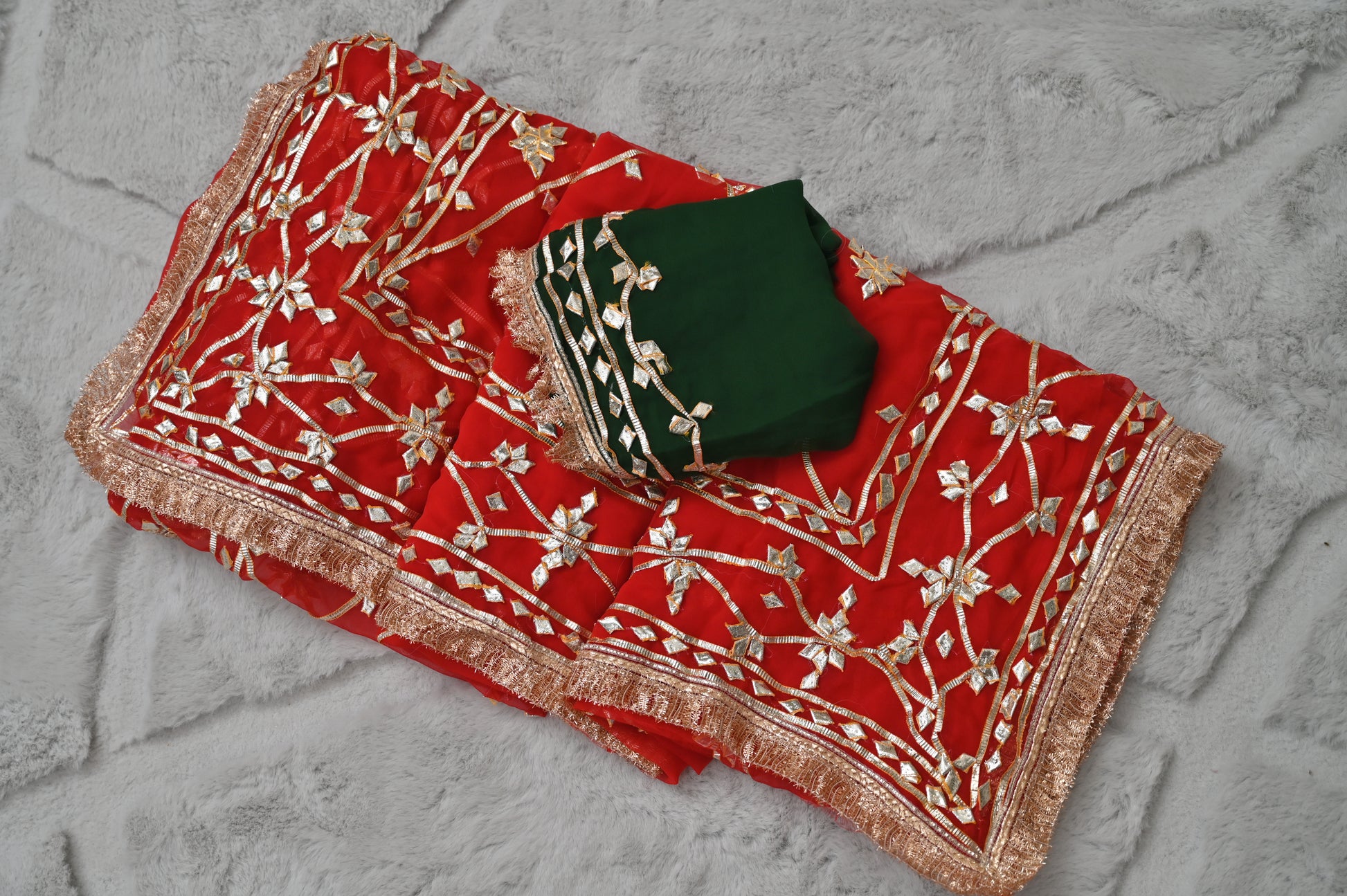 Beautiful Red Soft Chiffon Gota Zaal Work Saree with Unstitched Green Gota Work Blouse