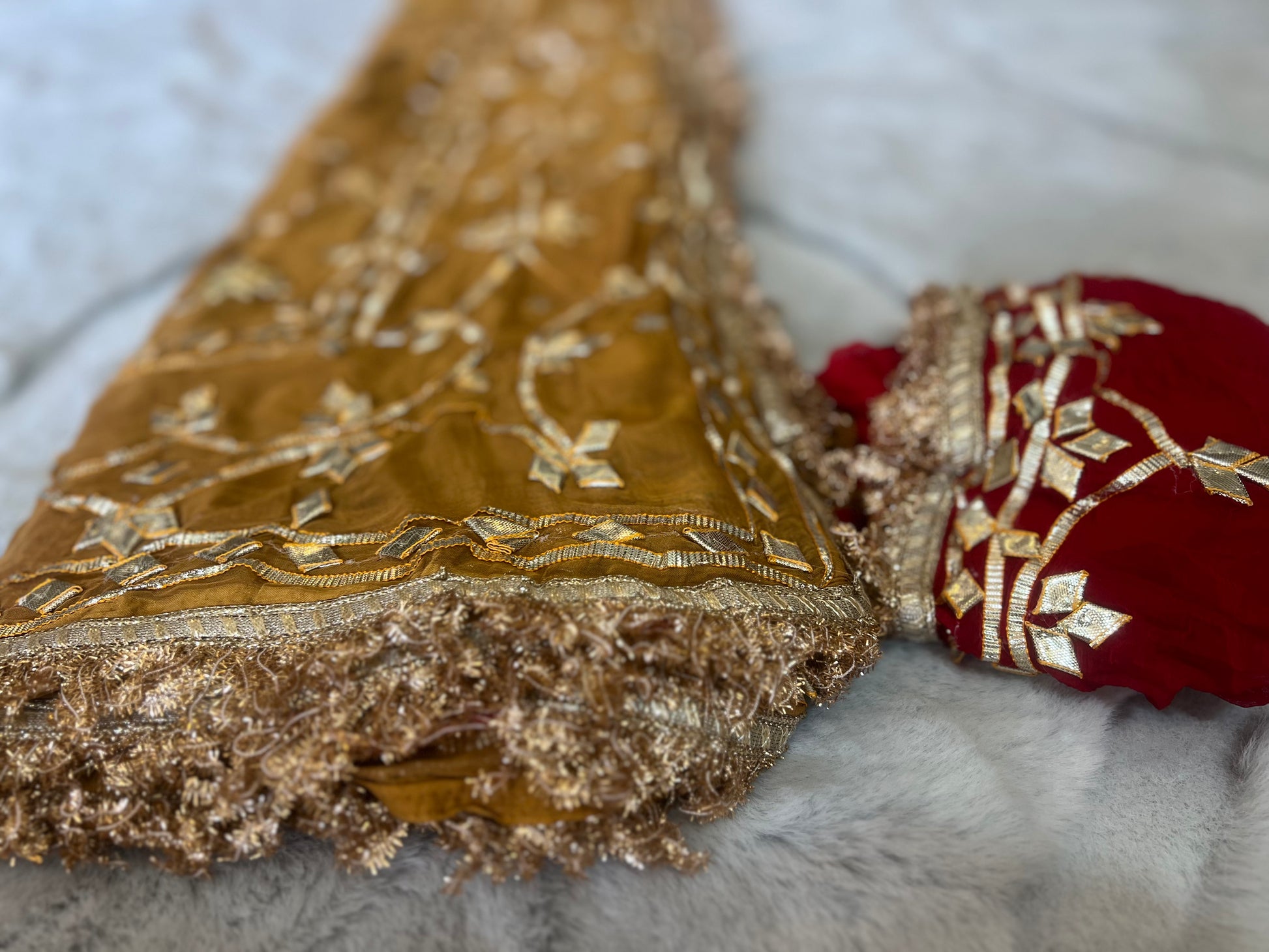 Beautiful Soft Chiffon Cheeku Color Gota Zaal Work Saree with Unstitched Red Gota Work Blouse