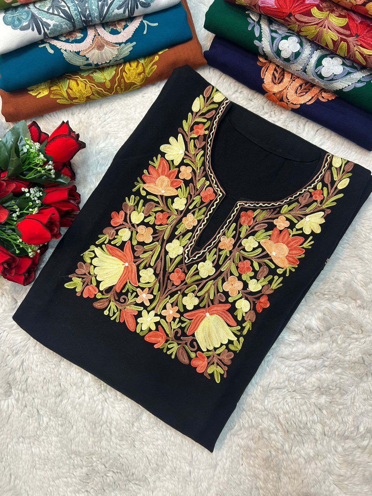 The Black Kashmiri Ariwork Pheran combines traditional craftsmanship with elegant design. Expertly hand-embroidered with intricate Ariwork, this garment showcases the rich textile heritage of Kashmir. Its comfortable silhouette provides warmth and style, making it ideal for cold weather while offering a refined, culturally inspired look. Perfect for those who appreciate authentic artisan techniques paired with functional winter wear.
