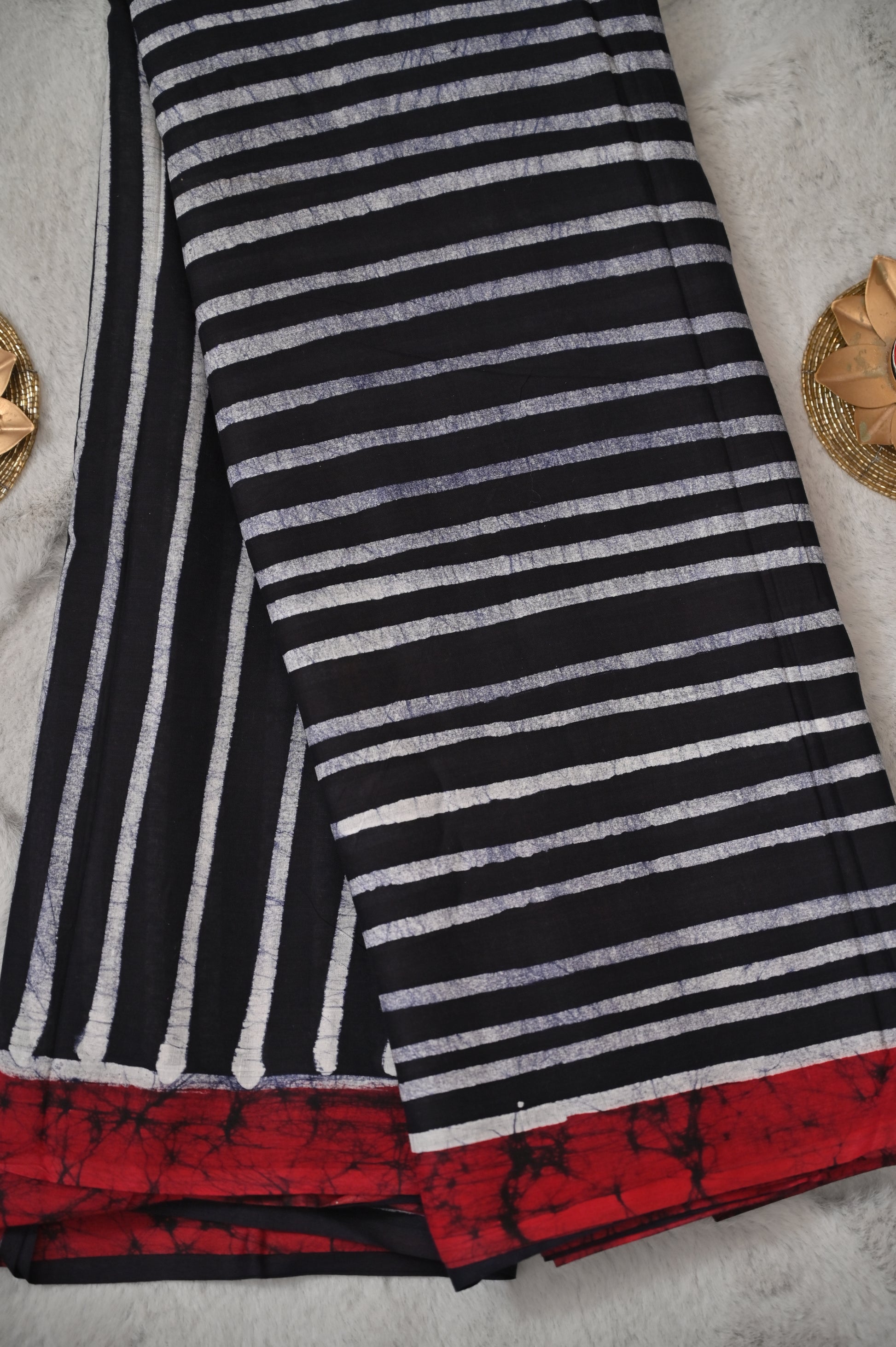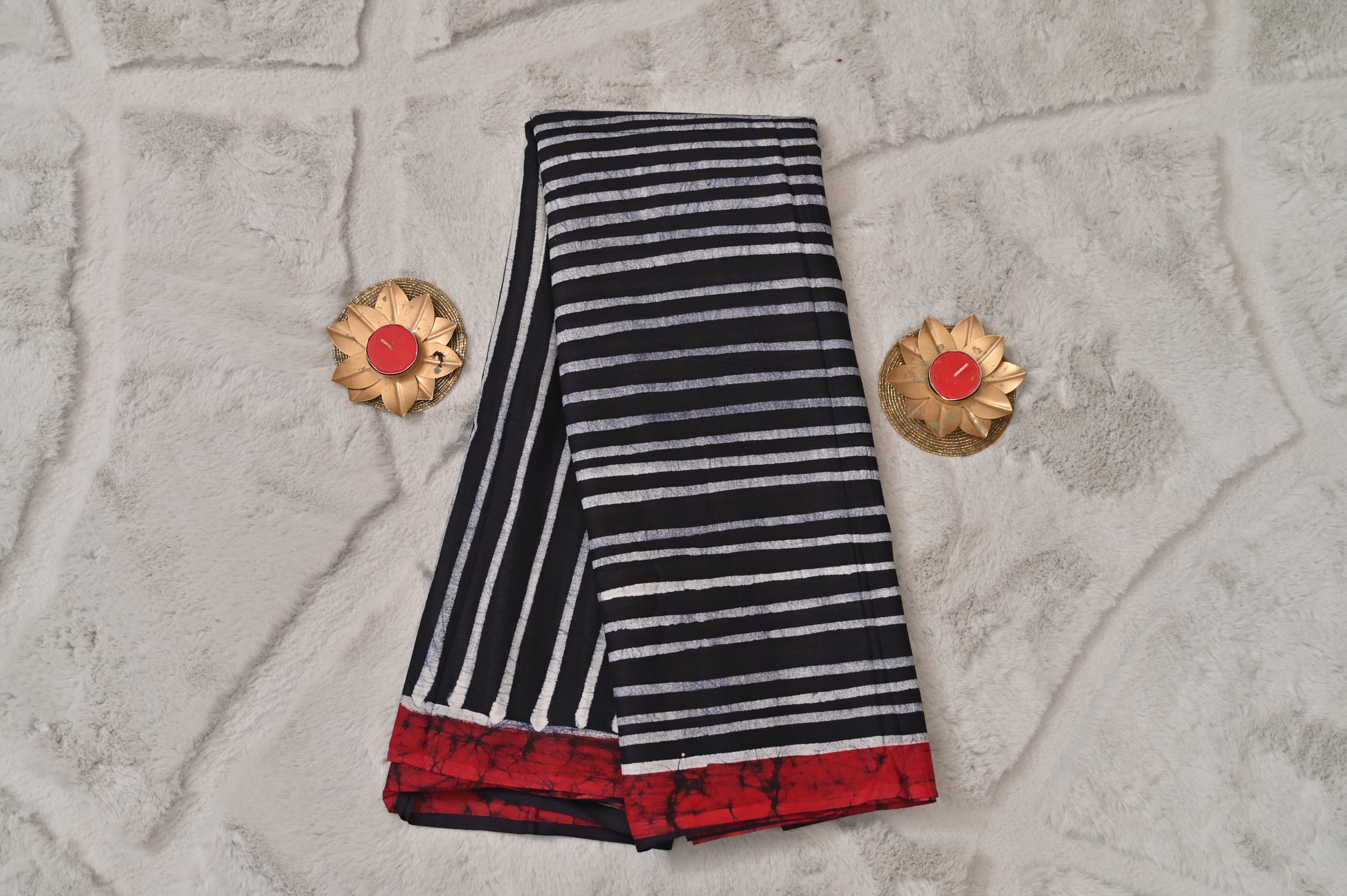 Charcoal and Red Vatik Print Saree with Horizontal and Vertical Stripes with Blouse (Running with Saree)
