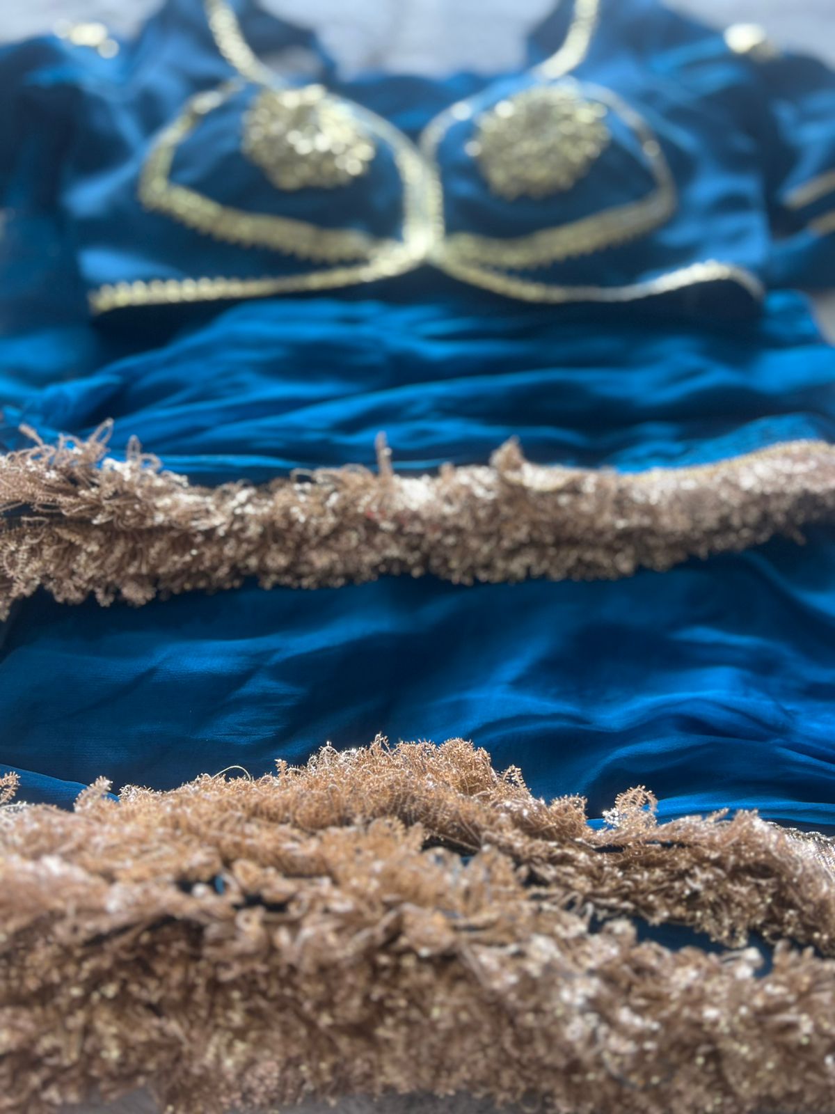 Designer Kanchli Blouse with Soft Chiffon Blue Saree with Traditional Border