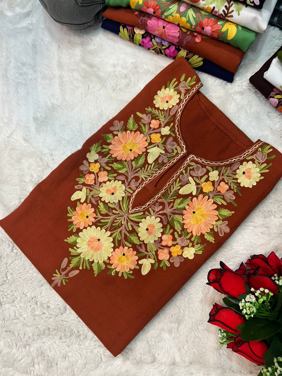 This Maroon Kashmiri Ariwork Pheran showcases exquisite traditional craftsmanship with intricate Ari embroidery, reflecting the rich heritage of Kashmir. Crafted from comfortable, warm fabric, it offers both elegance and practicality for colder climates. The deep maroon hue enhances its timeless appeal, making it a sophisticated choice for cultural or formal occasions.