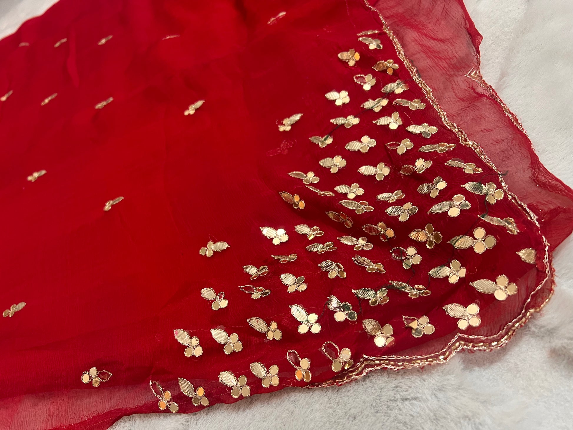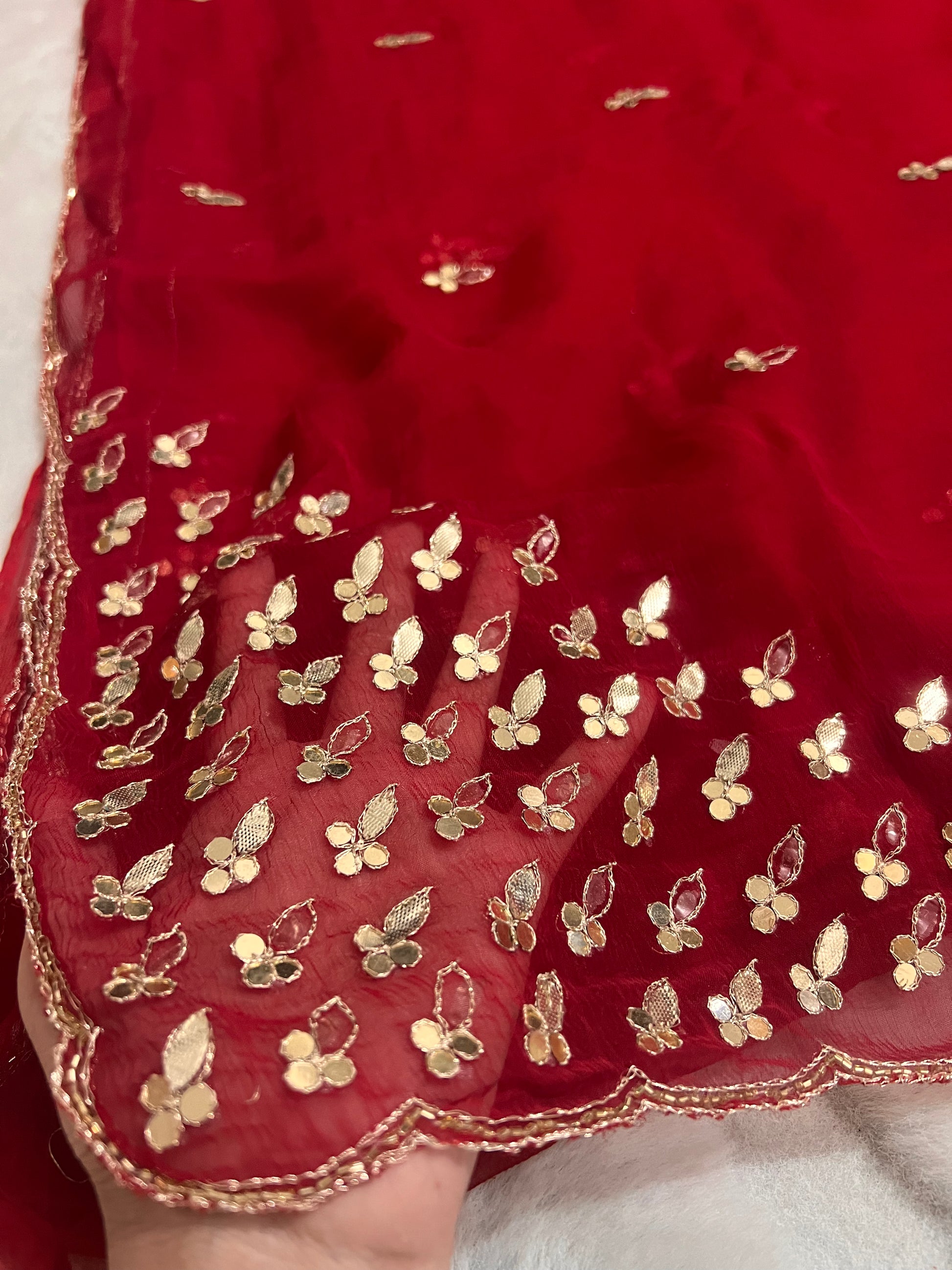 Elevate your ethnic wardrobe with this stunning red semi-chiffon sari, meticulously crafted with intricate gota work that showcases traditional artistry. The lightweight semi-chiffon fabric drapes gracefully, offering comfort without compromising on elegance. Complemented by a coordinating blouse piece, this ensemble is ready to wear for weddings, festivals, and special occasions. The delicate gota embellishments add a touch of sophistication, making it a versatile choice for both formal celebrations and cultural events. Perfect for those who appreciate timeless craftsmanship and refined style.