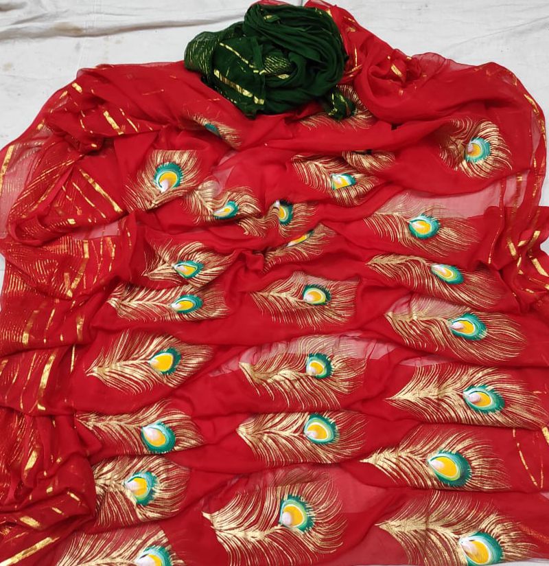 Morphankh Print Red Chiffon Saree
