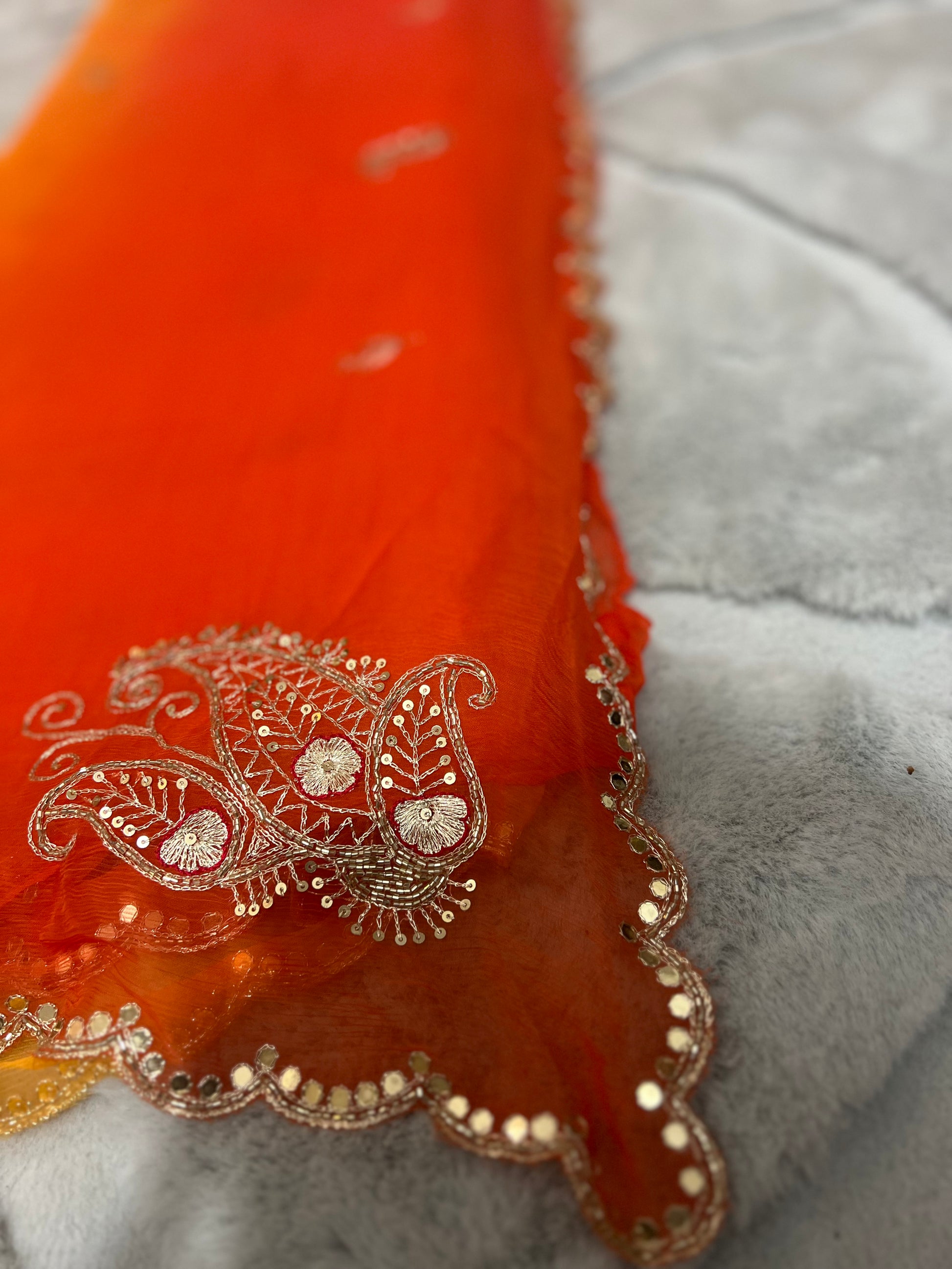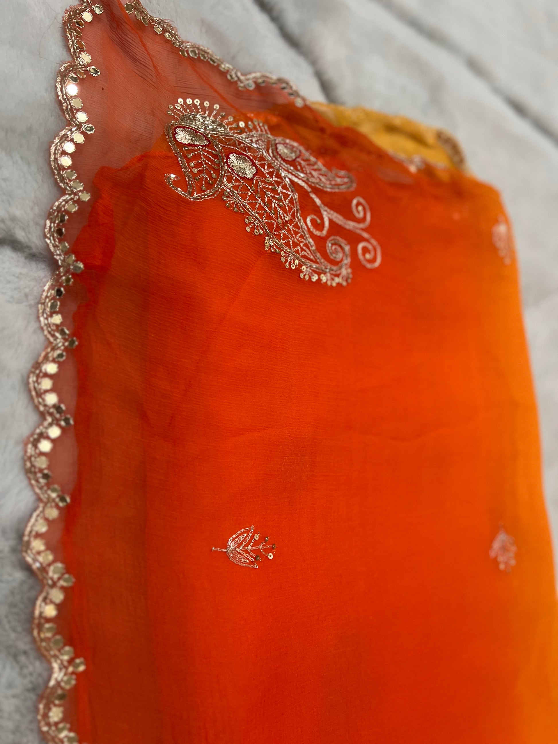 Pure chiffon Shaded Pita and Mirror Work, Sari with Pure Crêpe Yellow Mirror Work and Pita Work Blouse Piece