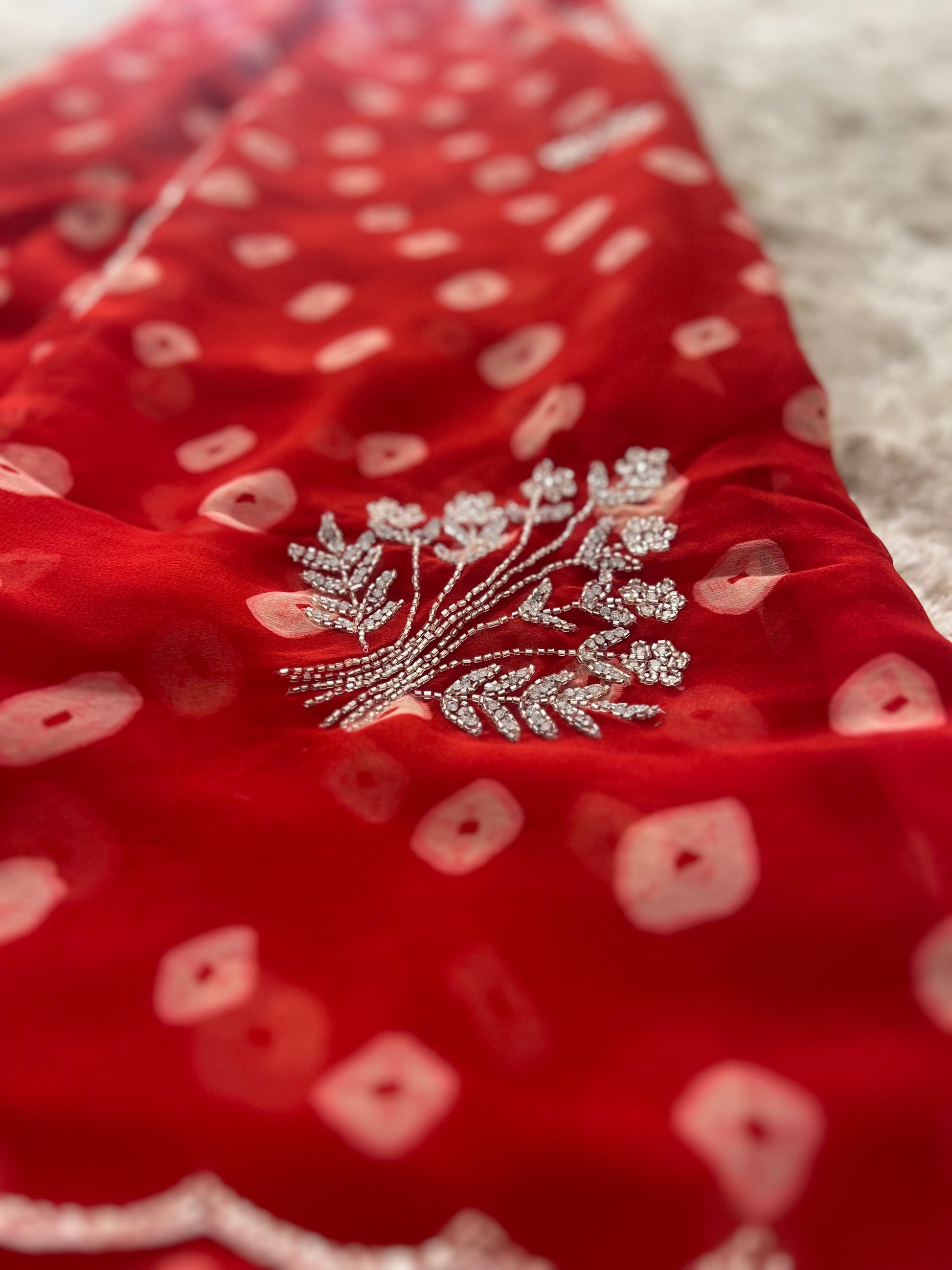 Red Soft Chiffon Bandhani Saree with White Stone Work with Same Fabric Matching Blouse Piece