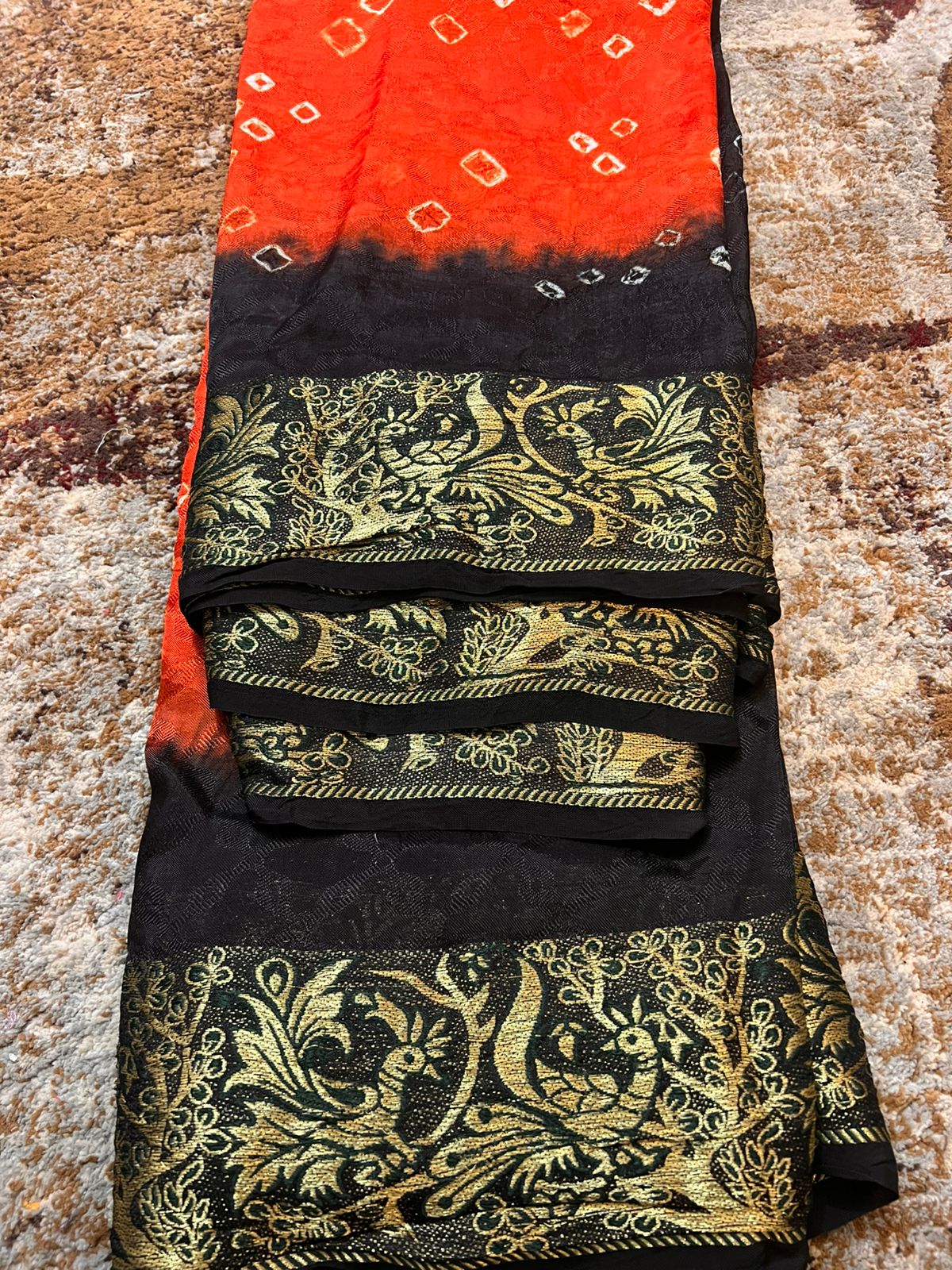 Soft Cotton Bandhini Saree Orange and Black with Barat Zari Border and Running Blouse