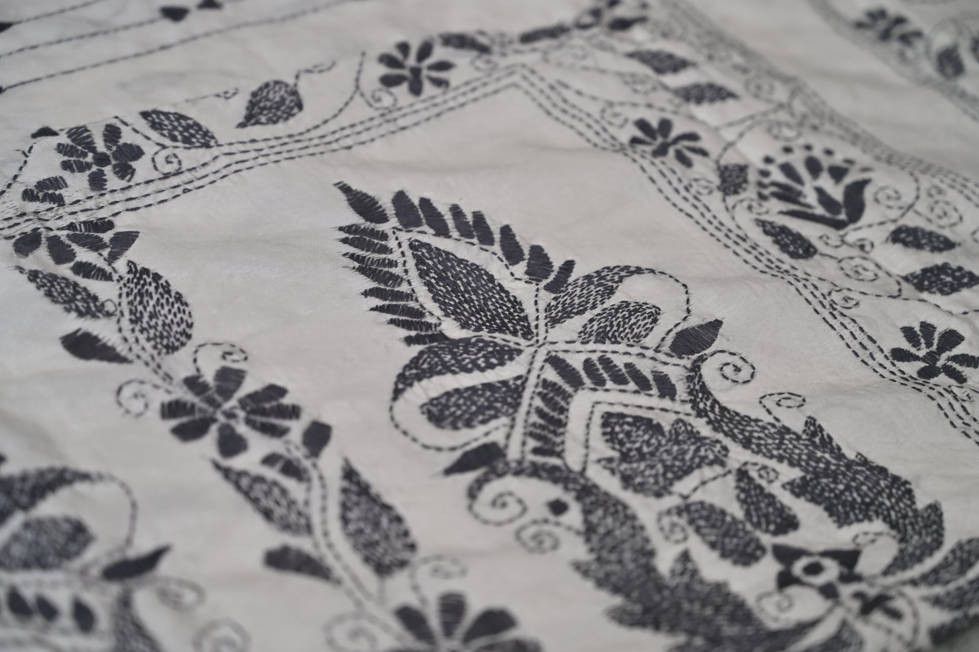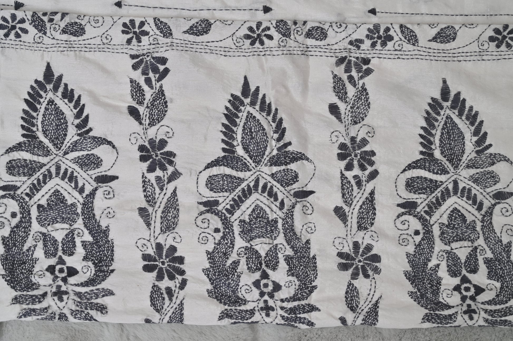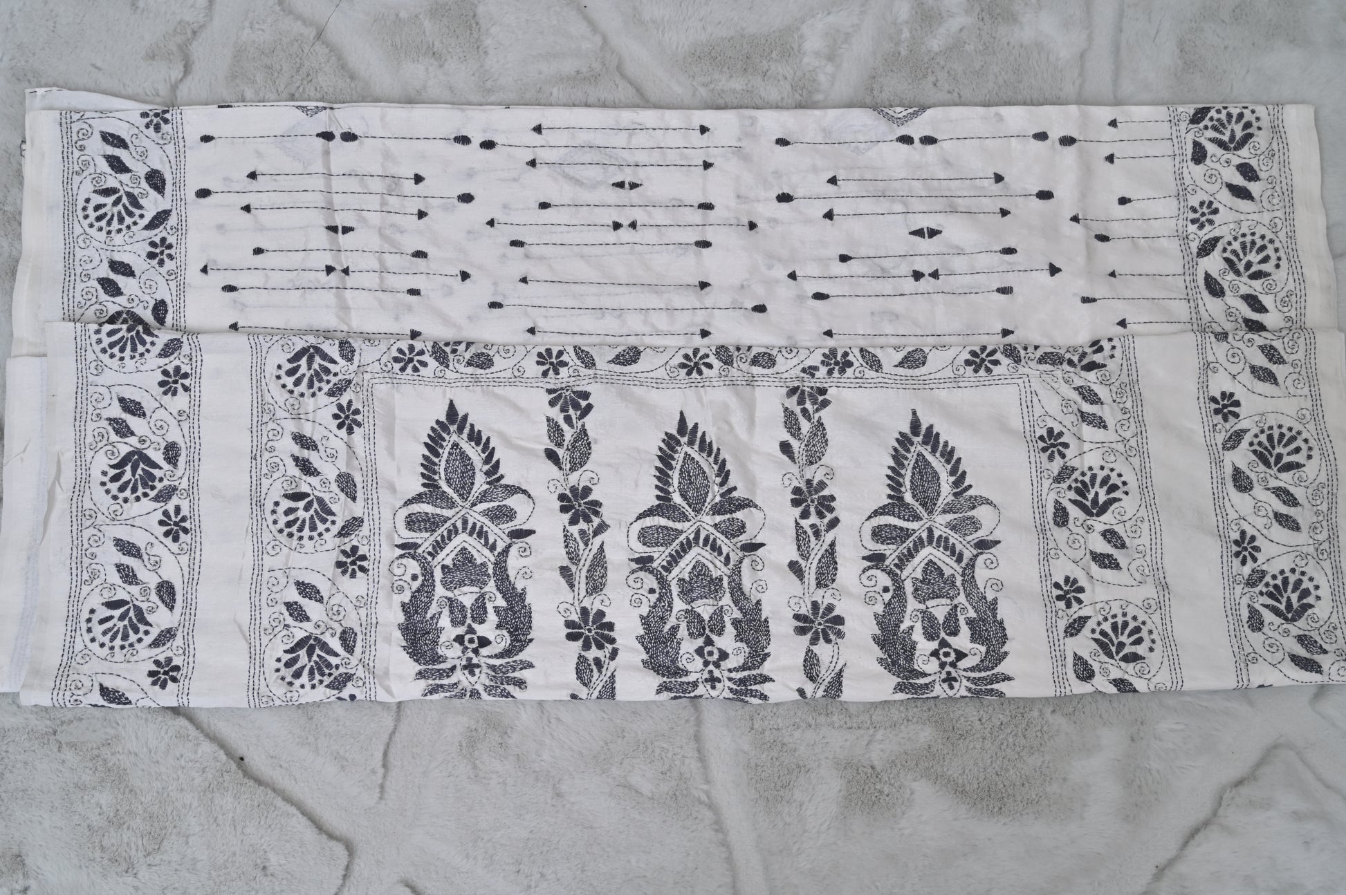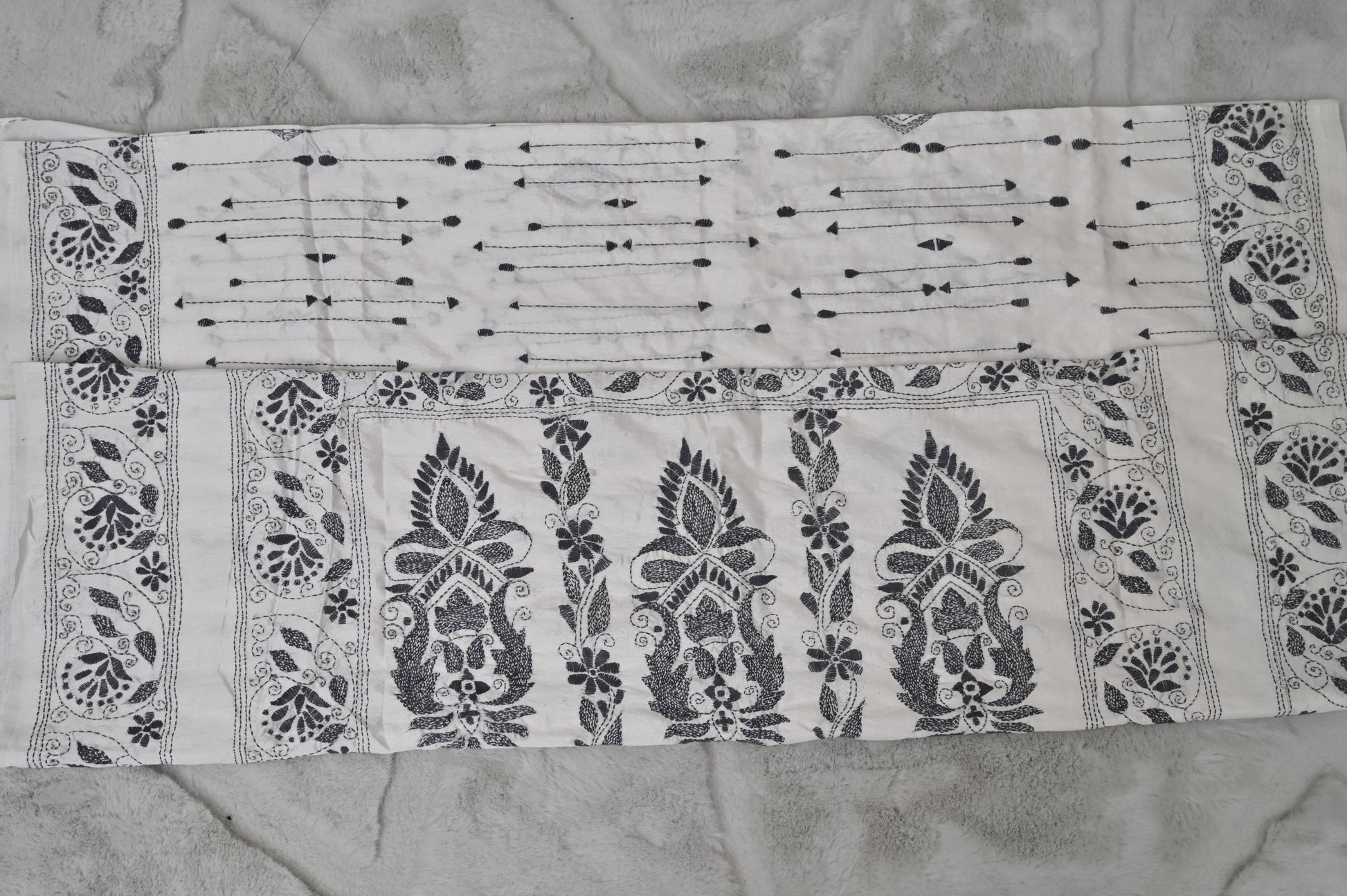 White and Grey Silk Kaatha Work Saree with Unstitched Blouse (Running With Saree)